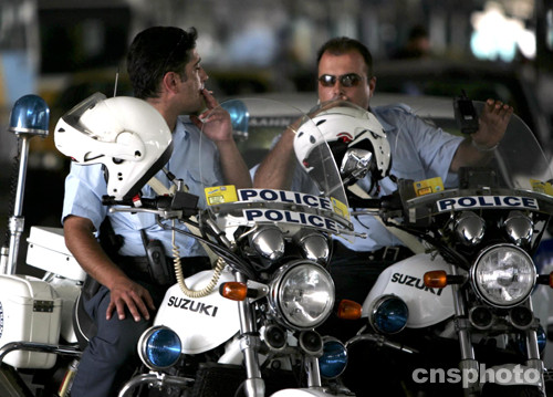 当地时间8月6日晚,两名为奥运会贵宾开道的雅典市警察在紧张的工作后,哥俩儿小聚抽支烟解解乏。雅典奥运会开支一再超标,其中投入安保的资金巨大,所有参与的警察通过各种方式的争取而获得了较为丰厚的加班费。中新社记者:任晨鸣