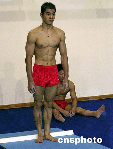 当地时间8月7日下午,世界冠军--中国男子体操队的主力选手邢傲伟等在雅典训练,备战即将开始的比赛。作者:沈晨
