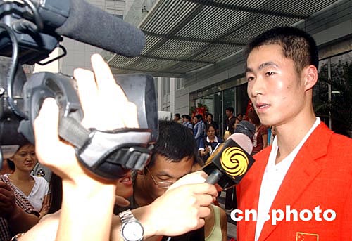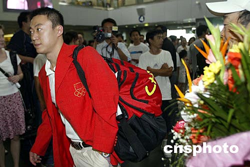 中国乒乓球队队员马琳在北京首都国际机场随同中国奥运军团奔赴雅典奥运会。中新社记者:盛佳鹏