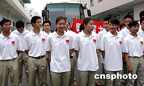8月8日,中国奥运军团从北京出征2004雅典奥运会,中国跳水队在北京集合准备出发奔赴雅典奥运会赛场。中新社记者:盛佳鹏