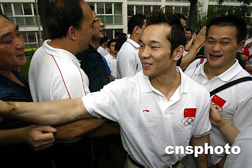 8月8日,中国奥运军团齐聚北京出征2004雅典奥运会,中国举重队队员乐茂盛(右二)和张国政(右一)在中国国家体育总局训练局和队友话别。中新社记者:盛佳鹏