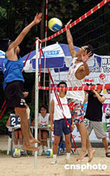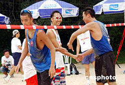 由香港排球总会、康乐及文化事务署及Bolle合办的“香港沙滩排球锦标赛2004”于8月8日在黄金海岸举行,进入男子组总决赛的选手周国伟、吴景鸿战胜对手获得冠军。者:洪少葵