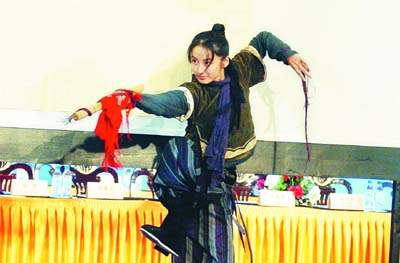 也许是受了最近几部大片首映式的启发,昨晚《七剑》的发布会别开生面几乎成了一台演出秀。一开场,《指环王》的电影音乐把徐克希望的“史诗般武侠”渲染得恰如其分,接着剧中扮演侠士的群众演员穿着古装轮番登场舞剑。在电影《少林寺》中有过出色表现的老演员于承惠,亮出了自己的绝活——现场挥墨写下了“七剑下天山”几个大字。