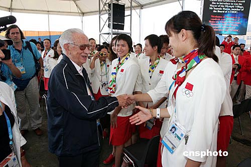 萨马兰奇与中国游泳队员握手交谈。当地时间八月九日上午,参加雅典奥运会的中国体育代表团在雅典奥运选手村举行升旗仪式时,国际奥委会主席萨马兰奇专程前来看望代表团成员。中新社记者:毛建军