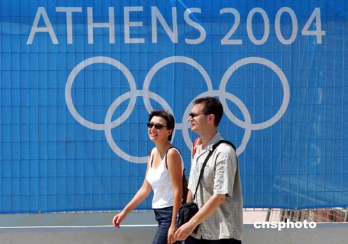 2004雅典奥运会开幕在即,雅典街头的“奥运味道”也越来越浓。图为一对青年男女经过雅典奥运标志牌。中新社记者:张炜