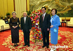 中新社北京八月九日电 (记者 朱大强)中国全国人大常委会委员长吴邦国今天在人民大会堂会见了柬埔寨国王诺罗敦·西哈努克和王后诺罗敦·莫尼列·西哈努克。宾主进行了亲切友好的交谈。
