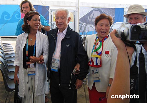 八月九日上午九时(雅典当地时间),萨马兰奇看望出席升旗仪式的中国代表团。作者:李孝谆