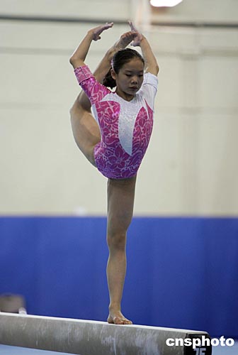 当地时间八月九日,中国女子体操队队员程菲在雅典奥运会体操馆进行平衡木训练。中新社记者:毛建军