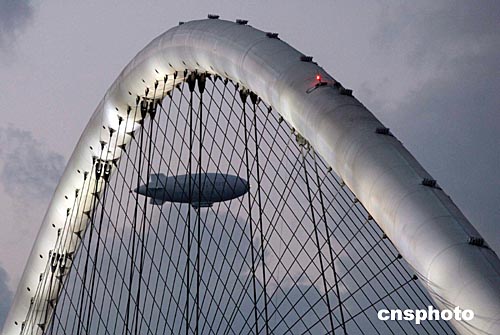 当时时间8月10日晚,一架监视飞艇从雅典主体育场上空飞过。体育场的巨大拱梁恰似一架巨大的竖琴,与飞艇共同奏出和谐的音符。这里正在举行最后一次开幕式彩排。中新社记者:张炜