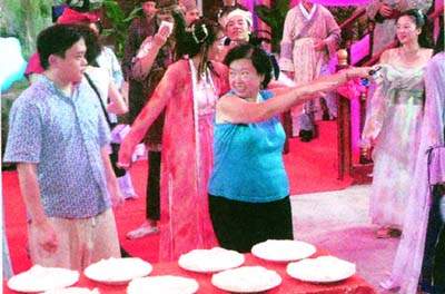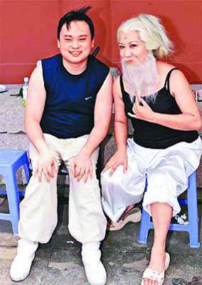 对于自己这个白衣长老的造型,薛家燕说:“本来不用粘这些胡子的,但我觉得粘上去会逼真很多,而且效果也很明显,不过粘了上去以后你会觉得很辛苦,特别是这么热的天气。”虽然只是合作了几天,但薛家燕对孔庆翔依然是赞不绝口,“他虽然是新人,但是我觉得他的演出已经是很专业和投入,他很努力,每天的对白都背得很熟。其实在这部电影里,我们不需要他有特别的演出,只要做本能的演出就可以了,例如你们刚才看到的,召唤飞鸟来救我他只需在旁边鼓掌就行了,而那些动作武打戏份就让我和恬妞去分担,我希望大家可以给点时间让他去磨练。”薛家燕对他的演出打了一个80分,欠缺的20分她认为应该是外界看了这部片以后给的。