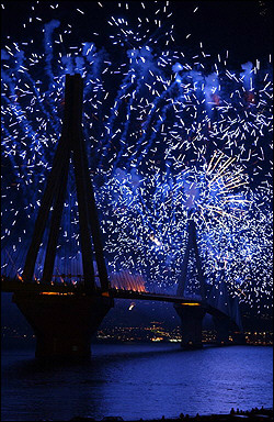 中新网8月11日电 据法新社消息,在雅典奥运到来之前,雅典已经开始着各项庆祝仪式。图为雅典Rio-Antirio大桥上的烟花汇演。