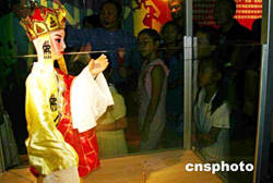 耗资二亿元新台币建成的台湾省台北市偶戏馆八月上旬开张。图为一尊唐僧木偶,吸引不少观众驻足。作者:董会峰
