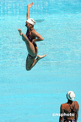 当地时间八月十一日上午,日本花样游泳选手在雅典奥运比赛场进行热身训练,动作奇特。中新社记者:毛建军