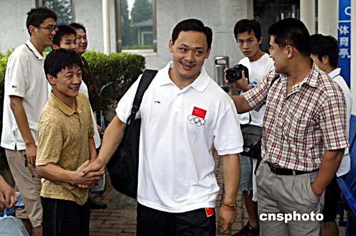 八月十二日,中国举重队著名选手占旭刚(中)在中国国家体育总局训练局与队友们告别奔赴雅典,这是中国举重队第二批队员出征雅典奥运会。中新社记者:盛佳鹏
