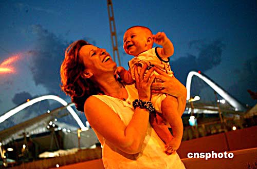 在雅典医院工作的护士撒拉玛抱着三个月大的儿子在奥运会主赛场前欢迎离开雅典108年的奥运回家,她说孩子六个月大时才能起名字,他该有个与奥运有关的名字作纪念。中新社记者:王瑶