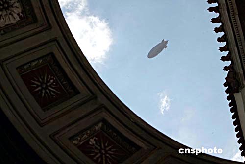 8月12日,一架监视飞艇从雅典市区上空飞过,监视各种情况的发生,以确保奥运会的安全。中新社记者:王瑶