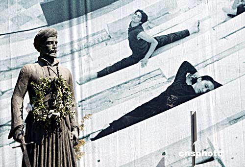 雅典街头的古代石像与奥运广告牌相互映衬,别据一格。中新社记者:王瑶