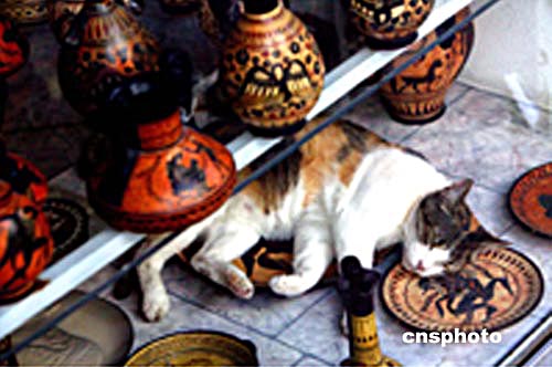 奥运开幕在即,尽管外界气氛紧张,一只家猫在雅典的工艺品商店橱窗里酣然入睡。中新社记者:王瑶