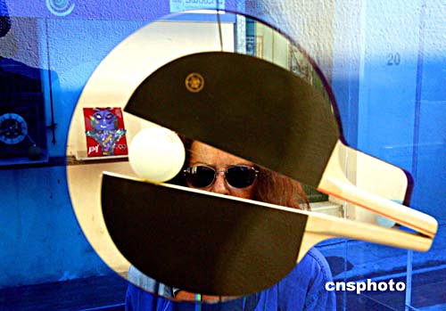奥运开幕前,在雅典市中心的奥运主题一条街上,一名游客正仔细观看作为艺术品陈列的乒乓球拍。中新社记者:王瑶