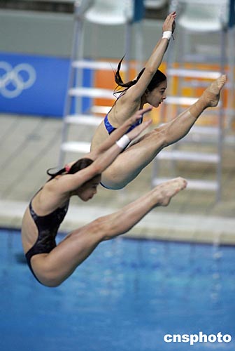 雅典奥运开赛首日(14日)将产生两枚跳水金牌。郭晶晶与吴敏霞是女子三米板双人金牌的最大热门。目前,郭晶晶和吴敏霞正在进行紧张的赛前训练。中新社记者:毛建军