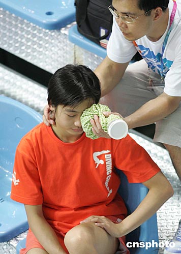 中国跳水女选手劳丽诗当地时间八月十二日在雅典训练前,由队医帮助用冰袋治疗眼睛疾患。中新社记者:毛建军