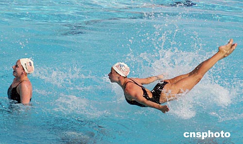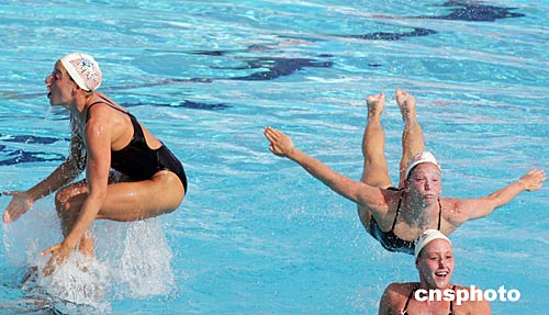 美国女子花样游泳队当地时间八月十二日下午在雅典奥运花样游泳比赛场进行赛前训练,动作新颖,造型别致。