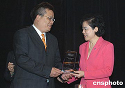 美东时间八月十二日,由美国联邦政府举办的纽约区二○○四年少数族裔企业发展周活动在纽约开幕。美国商务部少数族裔商业发展署副署长董继玲(右)向《星岛日报》纽约公司执行总监梅建国(左)颁发奖杯,表彰《星岛日报》成为本年度美国少数族裔的最佳企业。作者:陈建