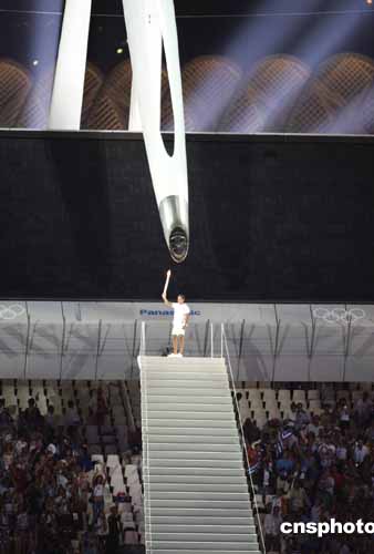 当地时间八月十三日晚,第二十八届奥运会在希腊雅典开幕,希腊前奥运冠军点燃奥运火炬。中新社记者:毛建军