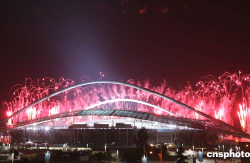 当地时间8月13日晚,雅典奥运会盛大的开幕式在主体育场举行,五颜六色的焰火映红雅典夜空。中新社记者:任晨鸣