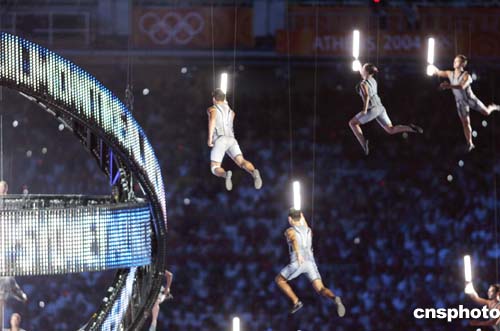 当地时间八月十三日晚,第二十八届奥运会在希腊雅典开幕。图为奥运开幕式上的飞天表演。中新社记者:毛建军