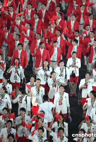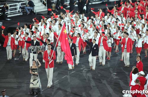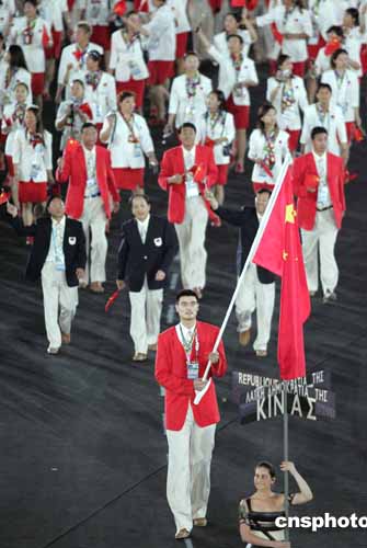 当地时间八月十三日晚,第二十八届奥运会在希腊雅典开幕。图为中国体育代表团以庞大阵容进入会场。中新社记者:毛建军