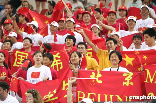 当地时间八月十四日,第二十八届奥运会女篮比赛拉开战幕,中国女篮在雅典赫利尼科篮球馆首战韩国以七十一比五十四获得胜利。图为中国啦啦队在赛场为女篮姑娘们呐喊助威。中新社记者:毛建军