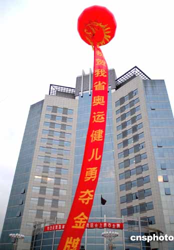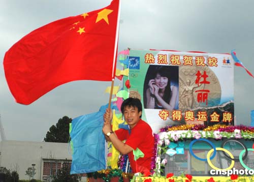 在八月十四日下午结束的雅典奥运会女子十米气步枪决赛中,山东女射击运动员杜丽夺得本届奥运会首枚金牌。杜丽的母校山东省竞技体育运动学校的师生扎制彩车在济南街头游行庆祝。作者:宋卫东