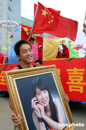 八月十四日十六点三十分,在雅典奥运会女子十米气步枪决赛中,山东籍选手杜丽夺得奥运会第一枚金牌。喜讯传来,曾经培养过她的山东省竞技体育学校的师生们挥舞着国旗欢呼庆祝。作者:王锋