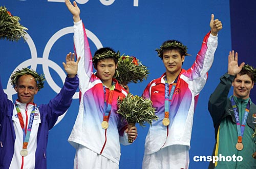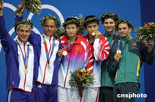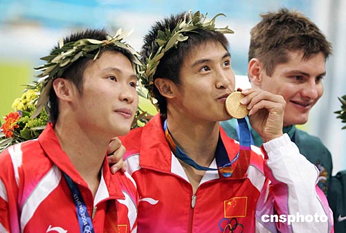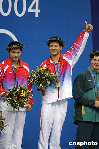 当地时间八月十四日晚,中国跳水队田亮、杨景辉在雅典奥运跳水馆获得男子双人十米跳台金牌。中新社记者:毛建军