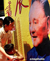 八月十五日在深圳举办的朱继峰纪念邓小平诞辰一百周年书画展上,两位小朋友在邓小平画像前。对邓小平有特殊感情的深圳人目前正采取多种形式纪念这位伟人。中新社记者:宋吉河