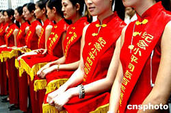 为期一周的朱继峰纪念邓小平诞辰一百周年书画展八月十五日在深圳举行,身披彩带的礼仪小姐阵容洋溢着喜庆气氛。中新社记者:宋吉河