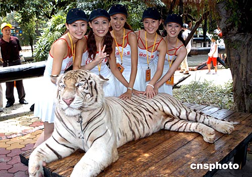 八月十五日,第五届明日之星影视新星的入选选手来到广州番禺香江野生动物世界拍摄外景。图为美女与白老虎合影。作者:刘卫勇