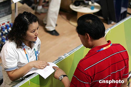 当地时间八月十五日上午,在雅典举行的第二十八届奥运会女子十米气手枪射击决赛赛场,中国射击队前奥运冠军张山为中央电视台做主持人客串记者。图为张山与中国射击队教练许海峰在场边交谈。中新社记者:毛建军