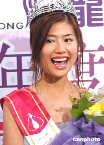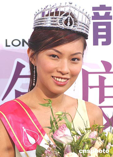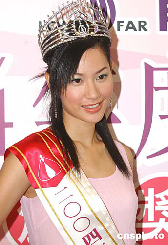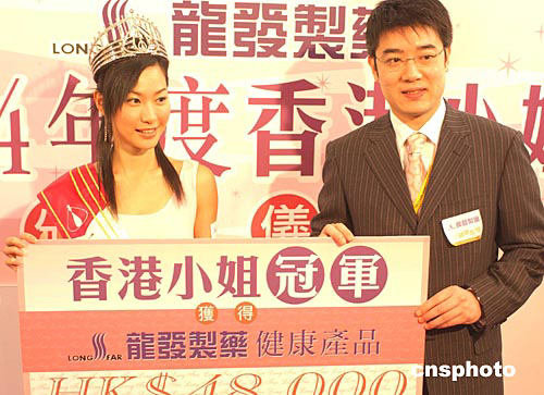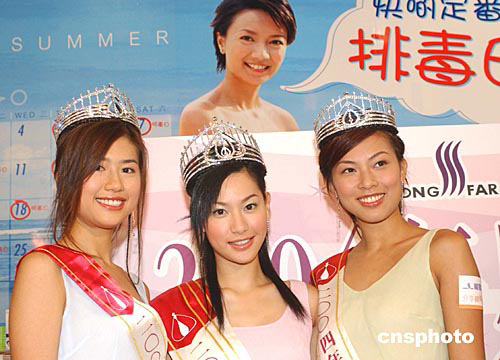 2004年度香港小姐冠军徐子珊﹑亚军朱慧敏﹑季军符思思16日在会展中心出席香港龙发制药集团颁奖仪式。中新社记者:赵振清