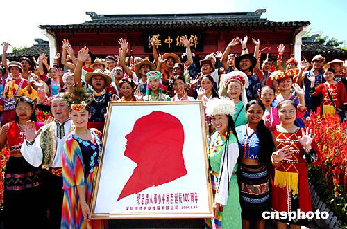 八月十六日,深圳锦绣中华的员工抬着邓小平巨幅剪影像纪念伟人诞辰百年。这里是当年邓小平南巡到过的地方。作者:陈文