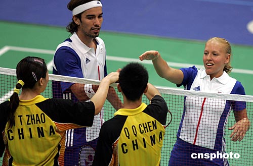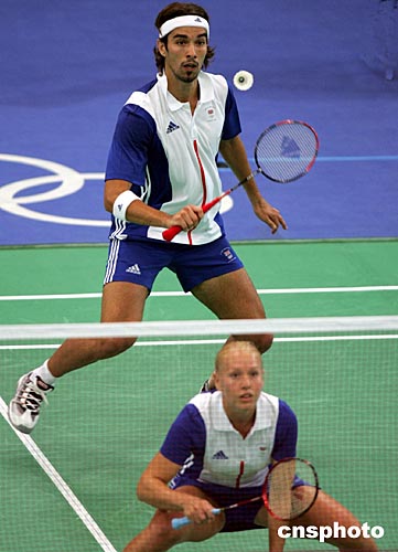 英国参加雅典奥运会羽毛球混合双打的罗伯逊、埃姆斯,当地时间8月16日以2比0选手战胜中国选手陈其遒、赵婷婷,进入前四名。