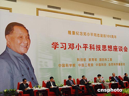 八月十六日下午,中国科学技术部、教育部、国防科学技术工业委员会等七家部委级单位在北京共同举行学习邓小平科技思想座谈会,纪念邓小平百年诞辰。中新社记者:孙自法