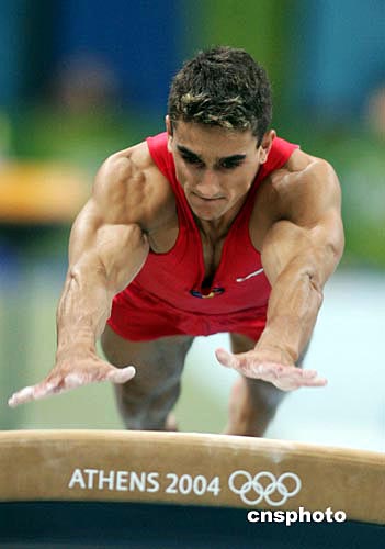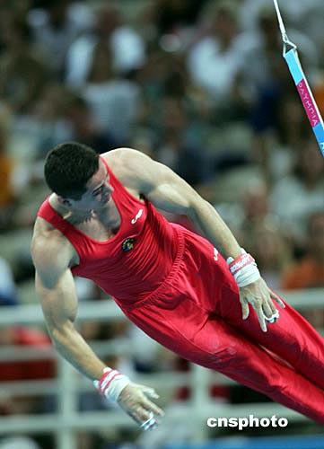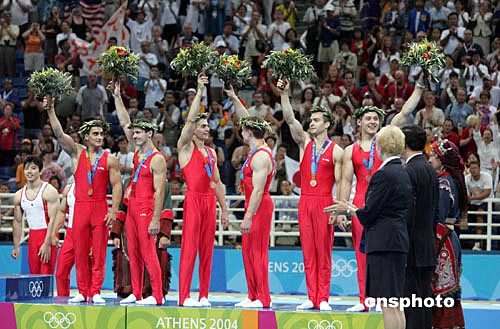 当地时间八月十六日晚,雅典奥运男子体操团体比赛在奥运体操比赛馆举行,罗马尼亚队获得铜牌。中新社记者:毛建军