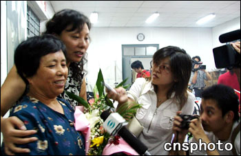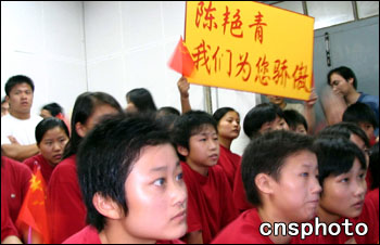 这时,我们也终于看到了陈艳青的妈妈陆榴云展露笑颜,笔者注意到,当陈艳青第一次出场的时候,陈妈妈便开始以手掩面,不敢直电视镜头里女儿那矫健的身影,只有在人们的欢呼声中得知女儿举起来了,才敢再次注视电视镜头。到了后来,陈妈妈更是紧张的说不出话来,在工作人员的帮助下服用了几颗保心丸才能把心情稳定。笔者后来才了解到,原来陈妈妈以前从来不观看女儿的举重比赛,今天初此看便是在如此隆重的赛事、如此隆重的场合,不免有点紧张过度了,当女儿最后摘得了金牌,这位淳朴的老人终于如释重负,当人们问她最想对远在雅典的女儿说什么时,她激动地说,“陈艳青,好样的!”