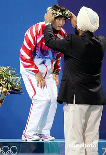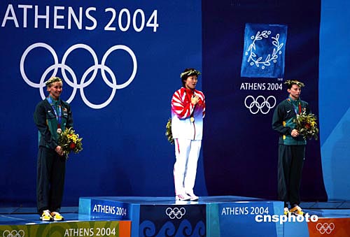 参加雅典奥运会游泳比赛的中国选手极少拥有问鼎奖牌实力者,罗雪娟在当地时间八月十六日晚奇迹般夺得女子一百米蛙泳金牌。这是她登上领奖台最高层,头戴橄榄桂冠,面对冉冉升起的中国国旗激动得和唱着国歌。中新社记者:任晨鸣
