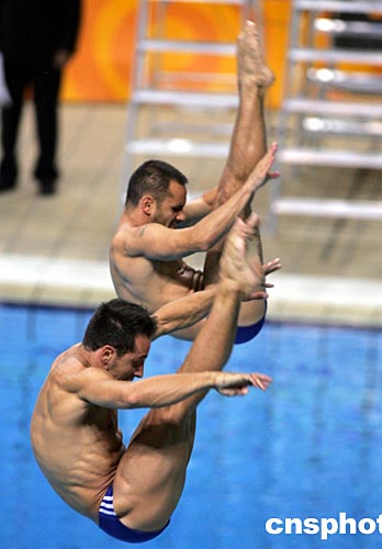 当地时间8月16日晚,中国选手彭勃、王克楠在雅典奥运会男子10米跳台双人决赛最后一跳中出现重大失误,而希腊选手则将古代神话再现奇迹般获得冠军。中新社记者:任晨鸣
