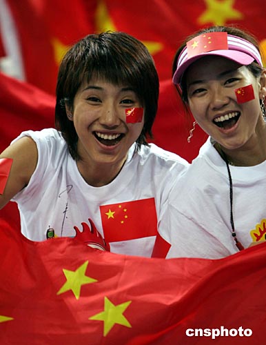 当地时间8月17日,中国男篮在以雅典奥运会小组赛第二场比赛中以69比62艰难战胜新西兰队,两名来自北京的女球迷到场高喊:“我爱你,中国男篮!”。作者:任晨鸣