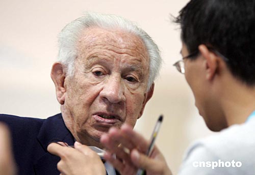 当地时间八月十七日,国际奥委会前主席萨马兰奇在雅典奥运射击赛场观看男子五十米手枪慢射比赛。中新社记者:毛建军