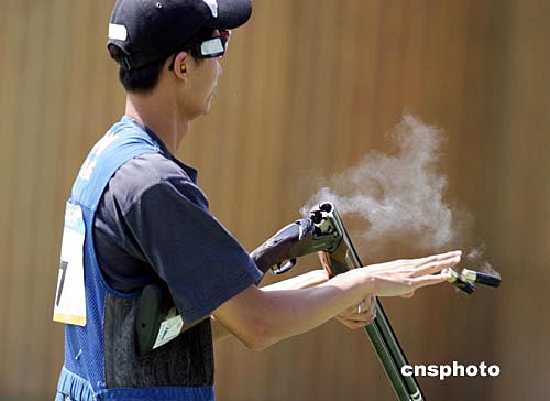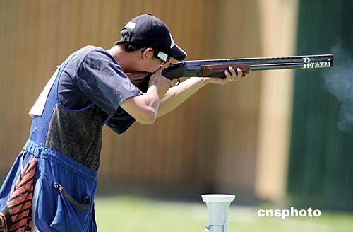 当地时间八月十七日,中国选手王正在雅典奥运男子双向飞碟射击比赛中获得铜牌。中新社记者:毛建军